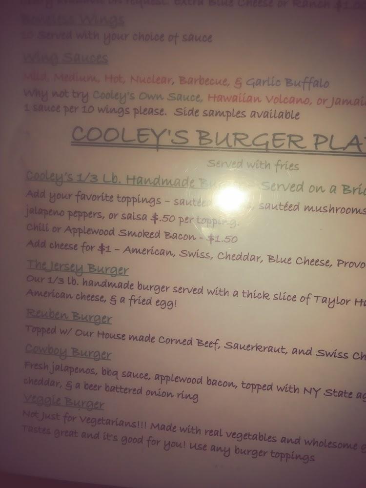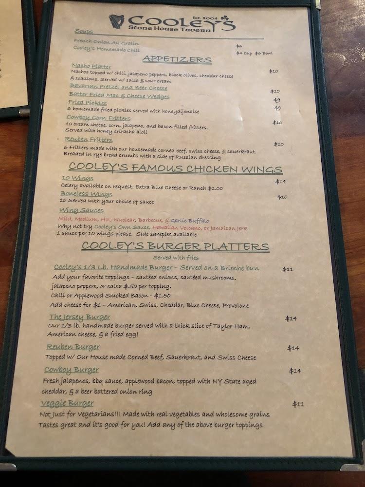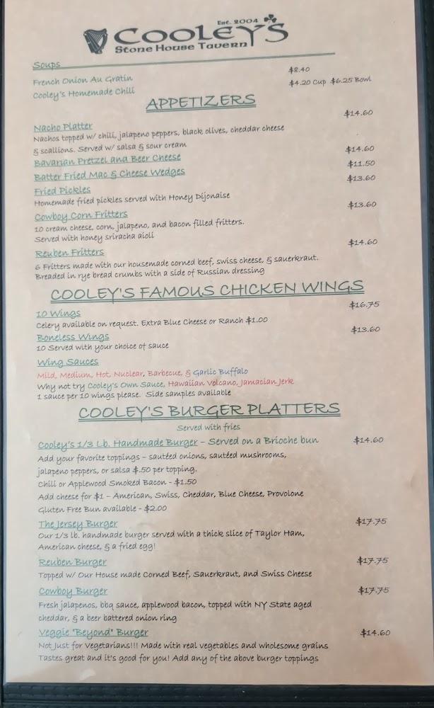 The menu at Cooley's Stone House Tavern features a blend of traditional pub food and local specialties. For appetizers, options like nacho platters and fried mac and cheese lead the way. Soups offered include the homemade chili and French onion, sure to warm you up on colder days.