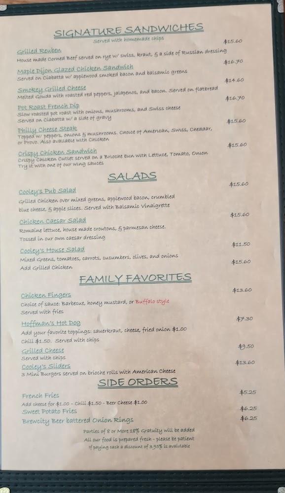 For main dishes, the tavern serves various sandwiches, burgers, and wraps. Standouts include the Philly Cheese Steak and Cooley's French Dip. Vegetarian options are also available, ensuring all diners are catered for.
